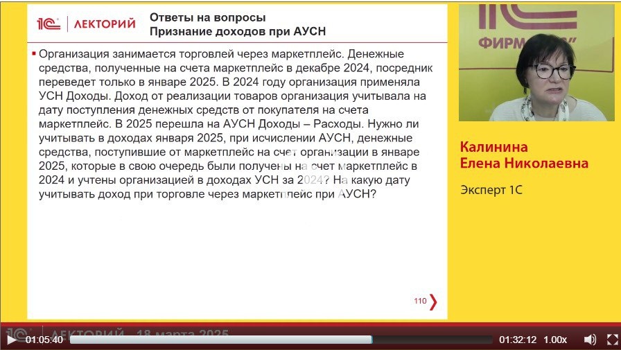 ❓Организация занимается торговлей через маркетплейс. Денежные средства, полученные на счета маркетплейс в декабре 2024, посредник переведет только в январе 2025. В 2024 году организация применяла УСН Доходы. Доход от реализации товаров организация учитывала на дату поступления денежных средств от покупателя на счета маркетплейс. В 2025 перешла на АУСН Доходы – Расходы. Нужно ли учитывать в доходах января 2025, при исчислении АУСН, денежные средства, поступившие от маркетплейс на счет организации в январе 2025, которые в свою очередь были получены на счет маркетплейс в 2024 и учтены организацией в доходах УСН за 2024? На какую дату учитывать доход при торговле через маркетплейс при АУСН? на этот и другие вопросы ответила Елена Калинина, эксперт 1С в лектории на тему Бухгалтерский и налоговый учет при работе с маркетплейсами на примере 1С:Бухгалтерии 8 Отзыв слушателя: Вебинар помог лучше понять алгоритм работы с маркетплейсами, лектор доступно объяснила порядок ведения операций в 1С,