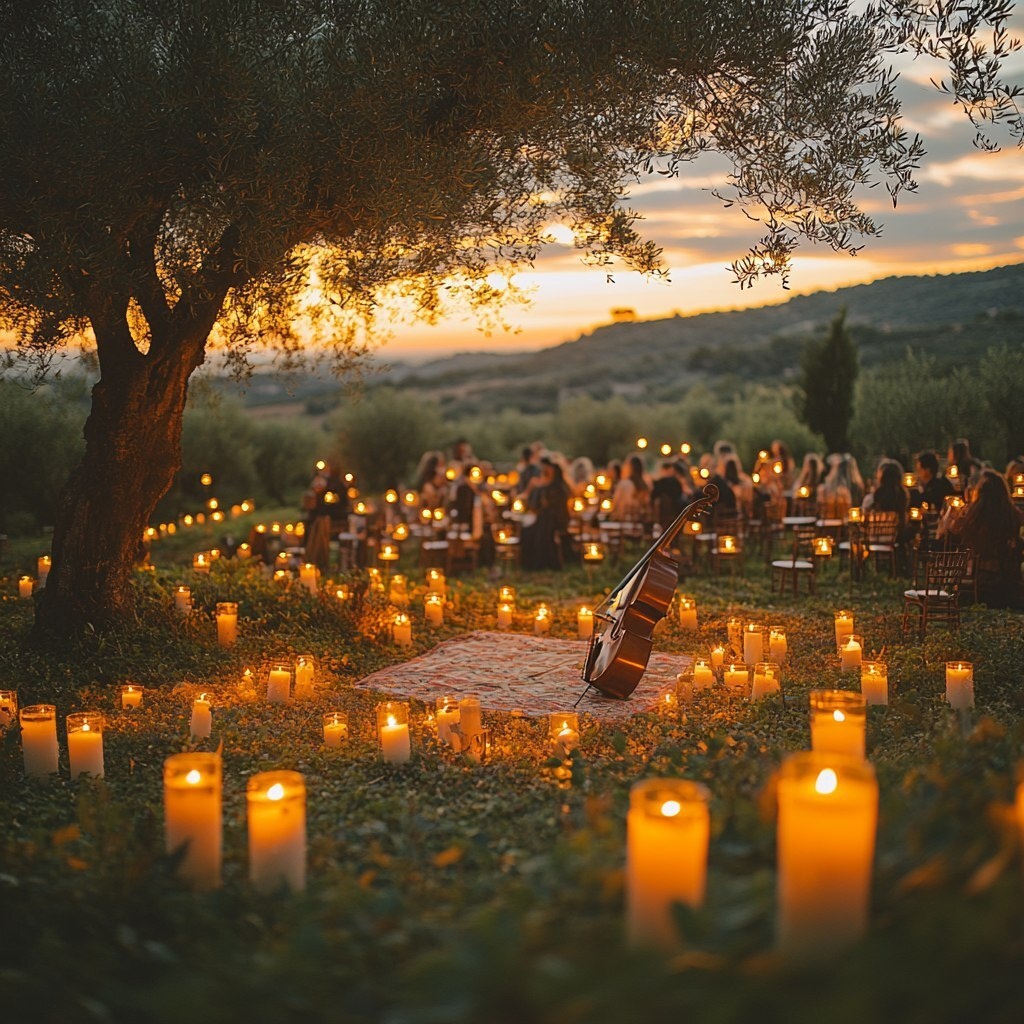 Создано на основе запроса: a Candlelight concert at sunset in an olive tree field in Provence | EMOTION: realistic as possible