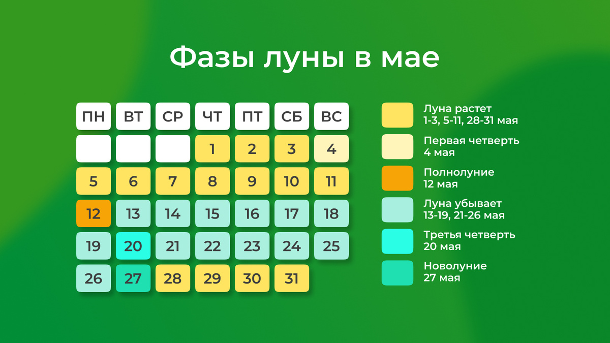 Май — месяц активной работы в саду и огороде. А поможет вам в этом лунный календарь! В нем вы найдете рекомендации по благоприятным дням для посева различных культур. Учитывая фазы Луны, вы сможете максимально эффективно использовать силы природы и получить лучшие результаты. Листайте карусель и смотрите лунный календарь на май!