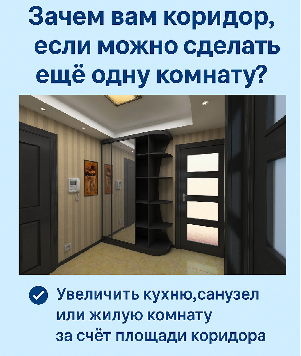 🛠 Перепланировка: зачем вам коридор, если можно сделать ещё одну комнату? Во многих новостройках встречаются длинные и широкие коридоры - как будто проектировщик просто устал и оставил как есть. 🤷🏻♂️ Неудивительно, что один из самых частых запросов от наших клиентов:
