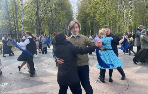 В Долгопрудном состоялся трогательный танцевальный флешмоб «Эхо Победы» в рамках Всероссийской патриотической акции «Улицы в лицах». 27 апреля в Центральном парке Победы под легендарную песню «Синий платочек» закружились в вальсе взрослые и дети. В руках каждого был синий платочек, как знак надежды, любви и памяти о героях войны. Эта песня стала одним из главных символов Победы. Солдаты уходили с ней в бой, вспоминали родных в короткие минуты отдыха и мечтали о скорой встрече с близкими. «К педагогам и танцорам наших коллективов «Караван» и «Элегантность» с радостью присоединялись все желающие горожане. В акции приняли участие около 70 человек, — рассказала директор Комплексного молодежного центра Долгопрудного Елена Леонова. — Получилось очень трогательно, нежно и в то же время масштабно! Ведь это не просто танец — это наша память и дань уважения поколению победителей».