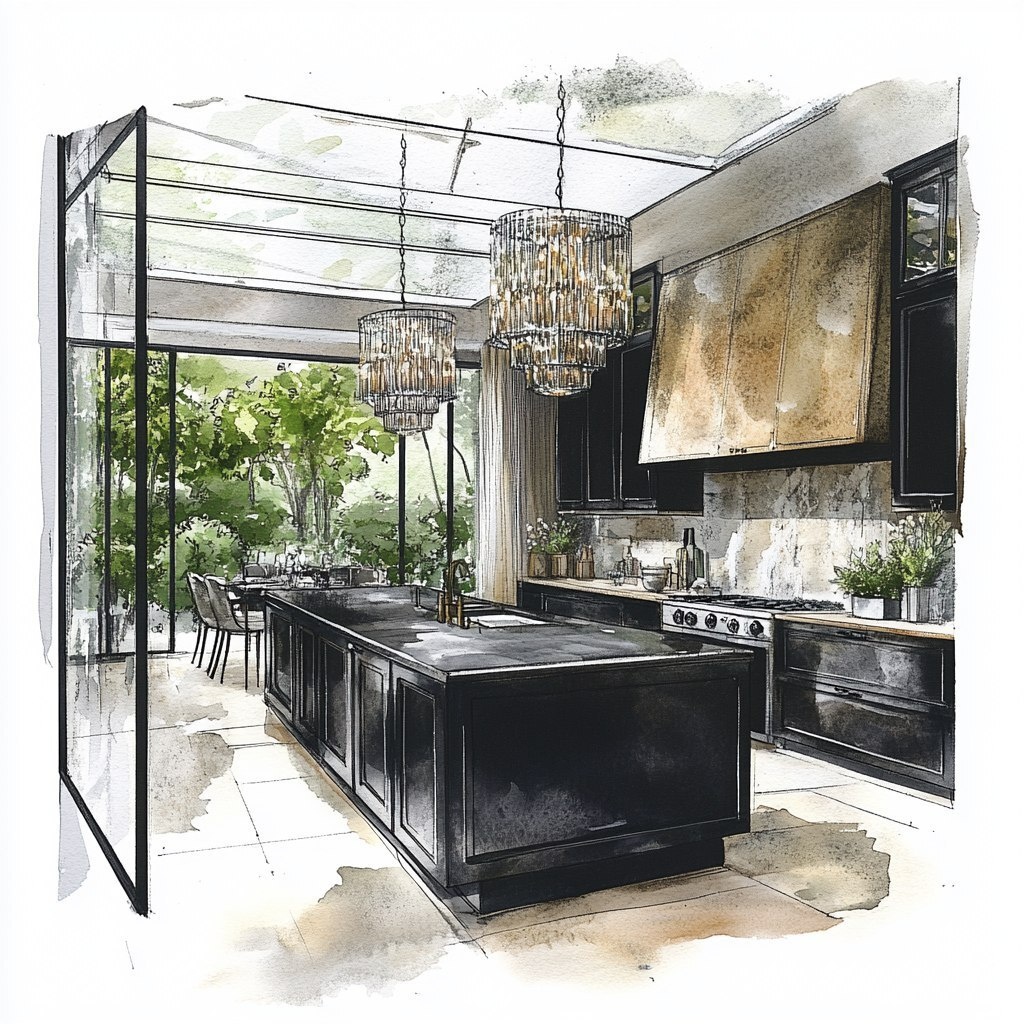 Создано на основе запроса: an interior designer watercolour sketch of a kitchen extension with a dark kitchen island over hanging large