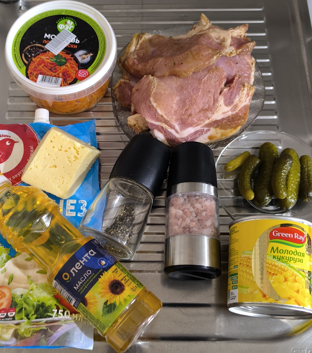 Иногда хочется удивлять и удивляться. Весна самое лучшее время радовать себя новыми вкусами. Сегодня предлагаю вам приготовить салат который не только порадует своим необычным и ярким вкусом, но и насытит на долгое время! Ингредиенты: - свинина ( у меня замаринованные стейки из карбоната. Мариновала в соевом соусе со специями для мяса.) 300 грамм - огурцы маринованные 150 грамм - сыр 100 грамм - морковка по-корейски 200 грамм - консервированная кукуруза 1 стандартная банка - растительное масло для обжаривания свинины. - майонез, соль и чёрный молотый перец по вкусу Свинину обжариваем, варим или запекаем до готовности. Остужаем и нарезаем. Сыр натираем на крупной терке. Огурцы нарезаем тонкой соломкой. С кукурузы сливаем всю жидкость. В миске соединяем кукурузу, морковку, огурцы и сыр. Тщательно перемешиваем. Добавляем майонез и специи. Снова перемешиваем.