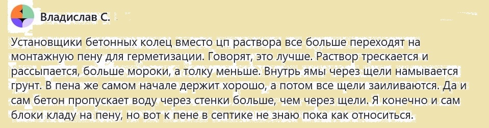 Любят наши люди всё запенивать. В последнее время добрались и до запенивания канализационных труб и колец, из которых делают септики. Вот два свеженьких примера от подписчиков: Что же это за специальная такая пена, подходящая для герметизации колец? Сейчас покажу, но сначала давайте всё же уточним, что никакая герметизация колец не только не нужна, но и невозможна. Поскольку сам материал колец (бетон) пористый и герметичным быть не может. И воду пропускает, и воздух. Речь идет о гидроизоляции швов, чтобы не получилось, как в сообщении Дарьи. А вот фрагмент её описания, взятый с сайта продавцов: Обратите внимание на подчеркнутый красным текст. С одной стороны эта пена предназначена для герметизации труб и колец, не пропускает воду, но не является водостойкой, то есть не подходит для гидроизоляции. Вот как такое может быть? А всё очень просто. Воду она не пропускает очень не долго, поскольку не является водостойкой. Но этого не долго вполне хватает "мастерам" на то, чтобы сдать работу з