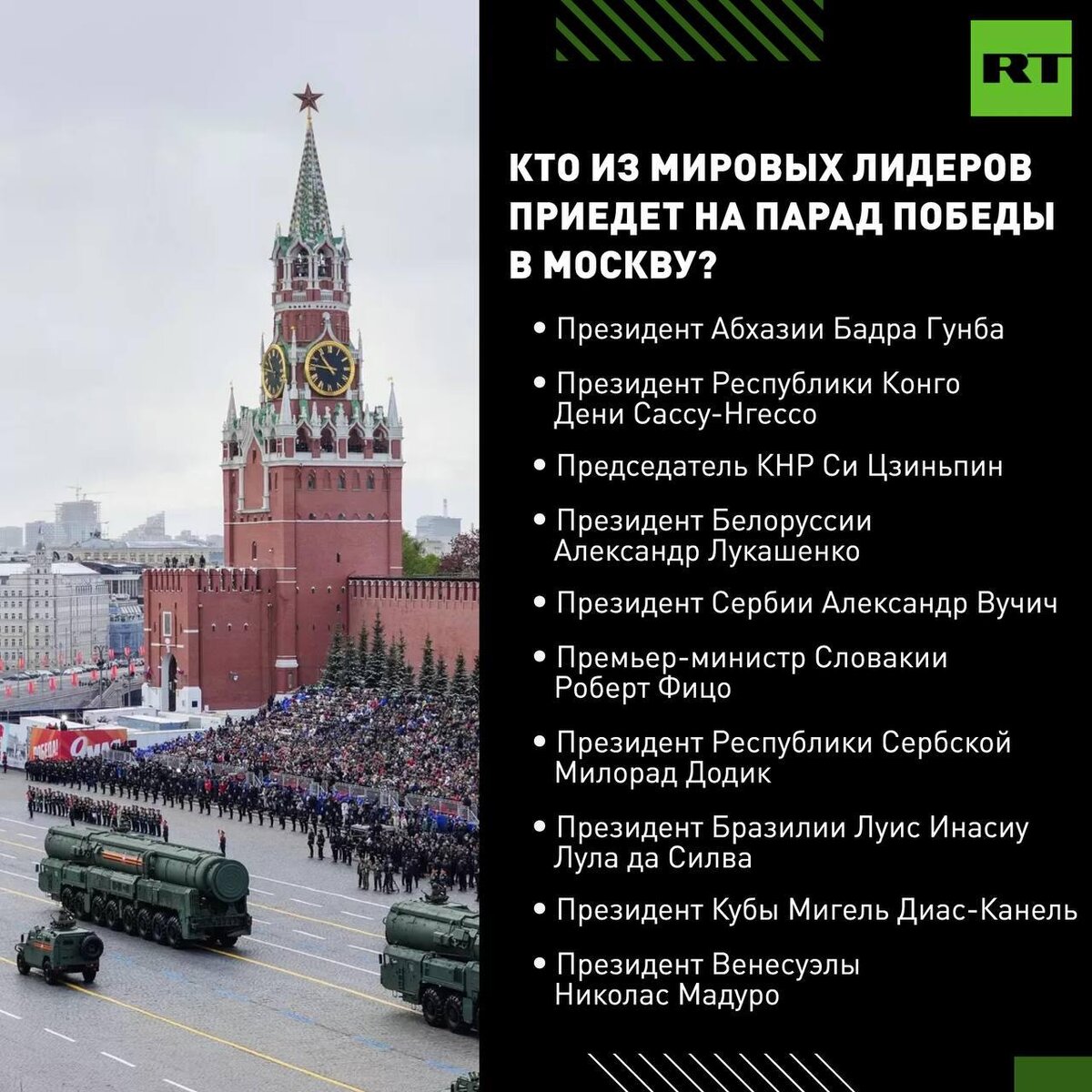 Президент Конго заявил, что приедет в Москву на парад Победы и надеется встретиться там с Путиным. Премьер Индии, президент Монголии и глава Туркменистана тоже получили приглашения на парад, но пока официально не подтвердили участие. Кто из мировых лидеров уже согласился приехать на 9 Мая — на графике. 🟩 Подписаться | Прислать новость | Читать аналитику