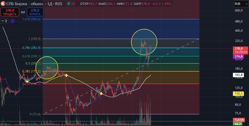 $SPBE 🔼Обновили предыдущий максимум, который был 191,8 и дошли до 339, 9 - Это хороший сигнал к продолжению роста. 🕯В данный момент построил первую волну краткосрочного восходящего тренда и строит вторую волну - коррекционную. ➡️Отталкивается от уровня 282,9, Я предполагаю, что пойдёт за 238, 1, если этот уровень будет пробит, то увидим движение цены до 206,7 и ниже. 🟢Для продолжения роста необходимо обновить предыдущий максимум, А значит цена должна вырасти выше 340 руб. Сейчас ситуация неопределённая, по осциллятору формирует сигнал в продажу НЕ ИИР #теханализ #инвестиции #трейдер #спб