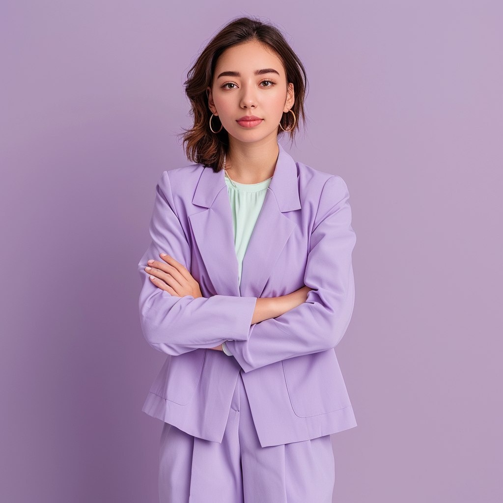 Создано на основе запроса: Professional woman happily standing confidently in the center,light purple pastel color minimalist clean