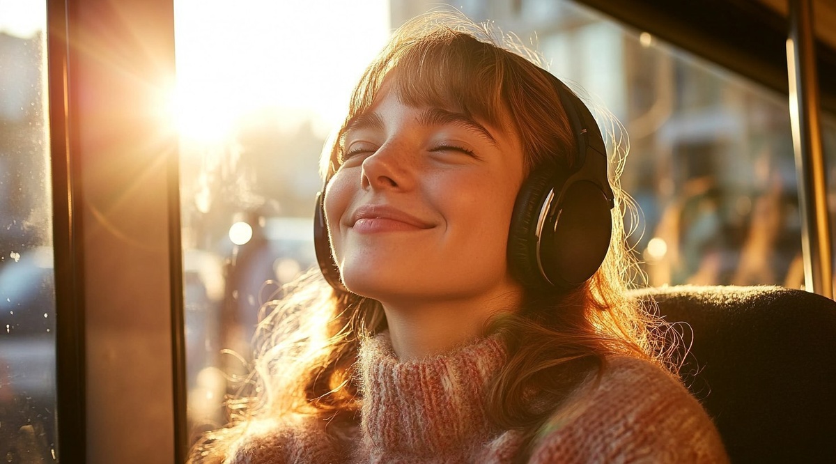 Создано на основе запроса: A happy 30s women wearing headphones, listening to music and smiling in the bus