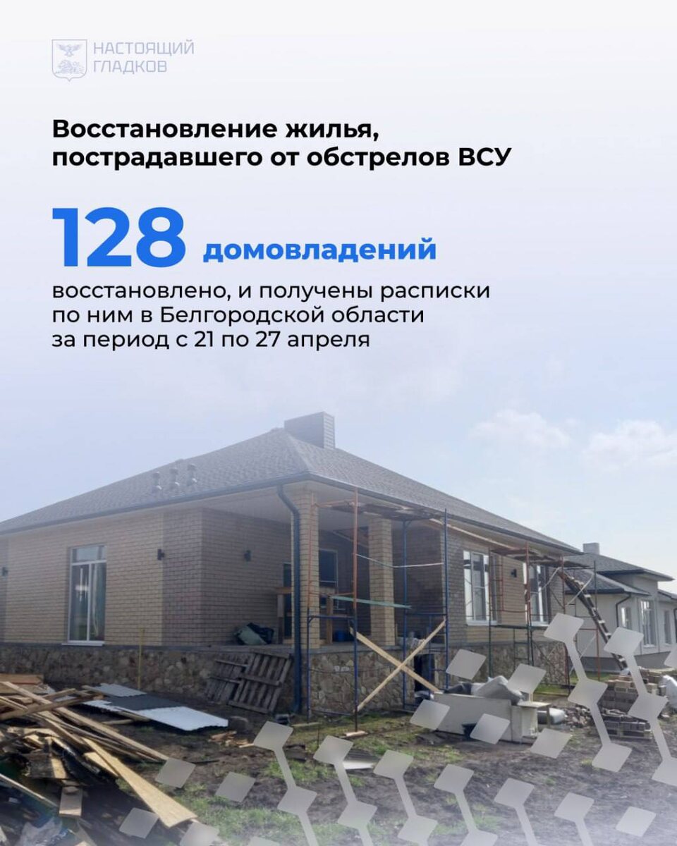 Губернатор опубликовал список адресов, на которых, по докладу глав районов и округов, выполнены работы по восстановлению жилья Всего за неделю в регионе восстановили 128 объектов. «В Шебекинском округе завершили 71 объект, закрыли контур на 5. За неделю выявлены 58 поврежденных домов и квартир, 16 автомобилей. Компенсация выплачена за 114 машин. По Белгородскому району за неделю полностью восстановлено 30 объектов. Прирост на 42 повреждённых жилых помещения и 11 автомобилей. Перечислены выплаты на компенсацию 169 машин. В Белгороде за прошлую неделю восстановлено 15 объектов. За этот же период повреждения выявлены в 15 жилых помещениях. В работе остаётся 81 объект. Выплачена компенсация за 10 машин. В Грайворонском округе восстановлено 7 объектов. За неделю повреждения зафиксированы по 30 жилым помещениям и по 20 машинам. Оплачено 65 автомобилей. В Валуйском округе закончены 5 частных домов и квартир, повреждены — 36, а также — 22 машины. В Борисовском районе за неделю поврежден