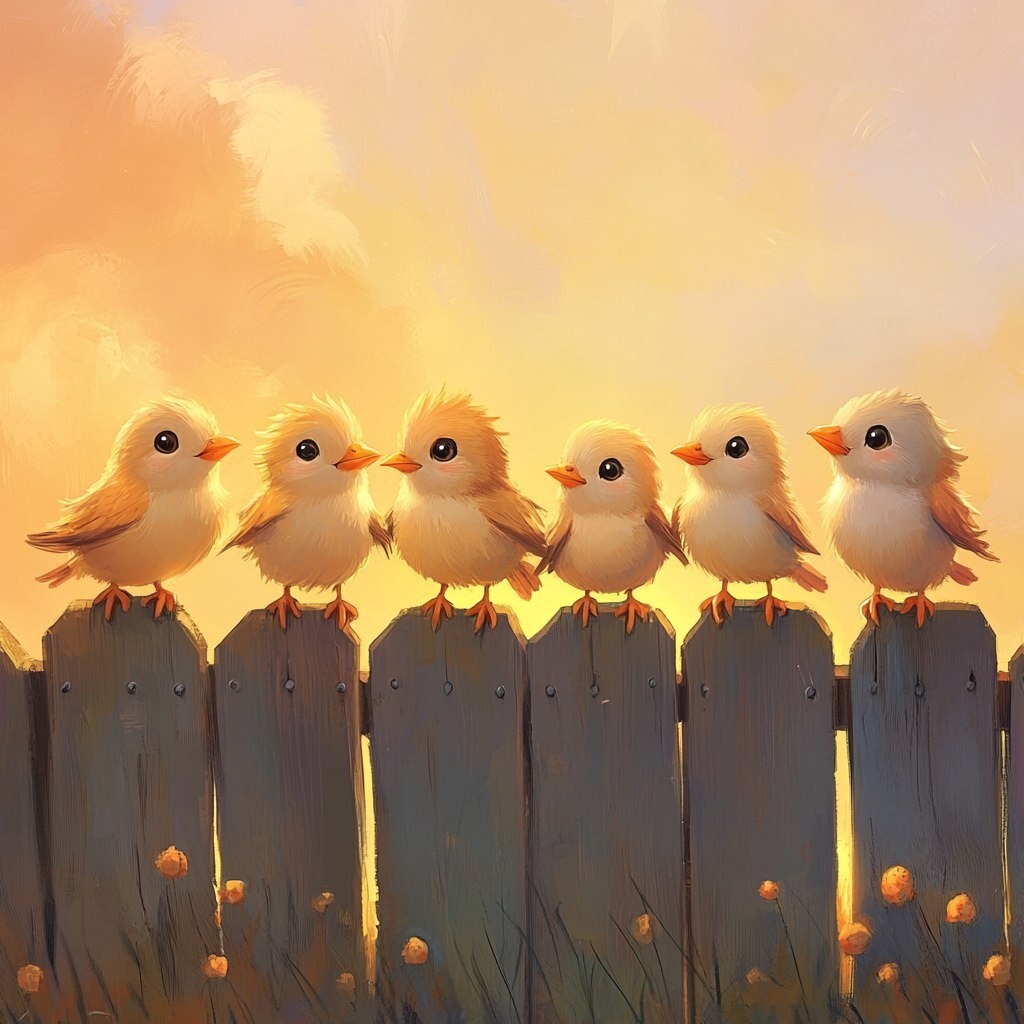 Создано на основе запроса: Six beautiful cartoon baby birds in the plain on the fence, definitely six