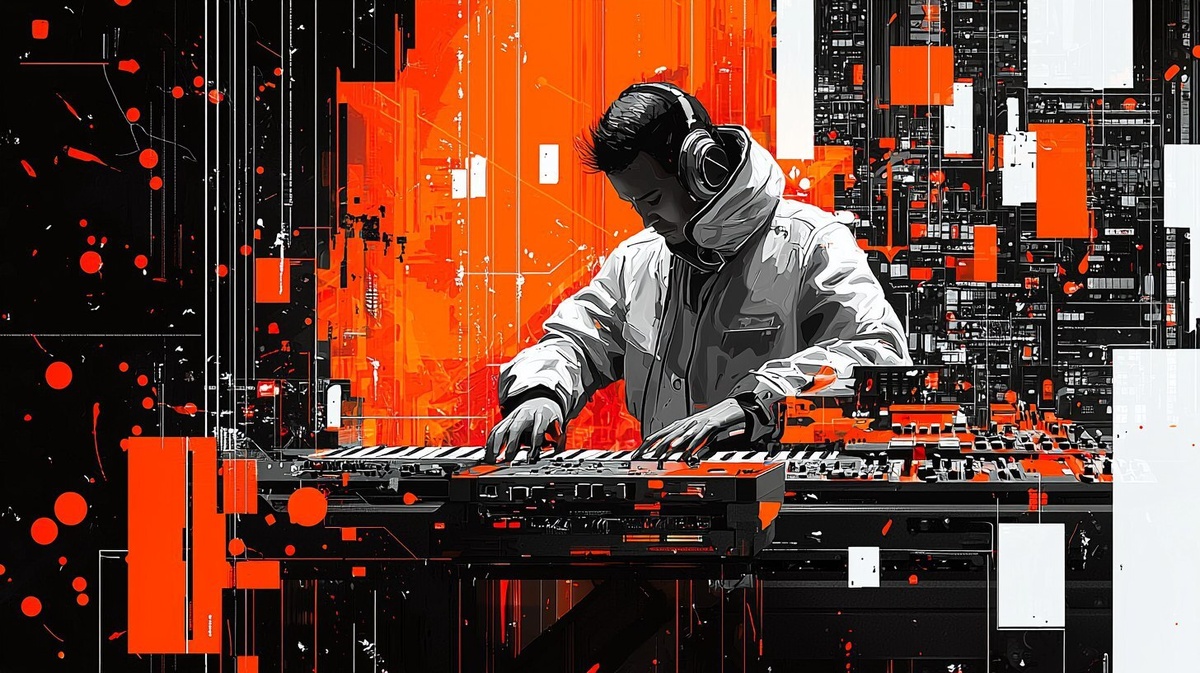 Создано на основе запроса: A cyberpunk-inspired digital artwork featuring an electronic musician with synthesizers, surrounded by vibrant orange and white color blocks against a black background. The design incorporates elements of the electronic music genre, creating a futuristic and visually striking composition in the style of focus on the musician --- Автоперевод: Цифровое произведение, вдохновленное киберпанк, с электронным музыкантом с синтезаторами, окруженным яркими оранжевыми и белыми цветными блоками на черном фоне. Как тебе такая генерация? 🤔 https://dzen.ru/id/65c0c65c86e4f837c27b24d7 #ИИ #AI #нейросеть #midjourney #art