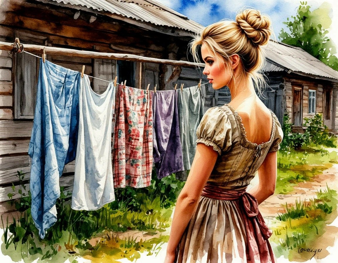 Бытовой реализм в противовес всяким феям, эльфийкам и прочим бабам с рогами. Attractive blonde woman with hair tied in a bun, in a rustic dress, hangs washed clothes on a clothesline in the yard, background house in the village full body, side view, watercolor noir art, airbrush, Mikhail Garmash style #neuroart #нейроарт #ai #ии #нейросеть #картинки #искусственныйинтеллект #цифровоеискусство #digitalart #арт #art #prompt #промпт #подсказка