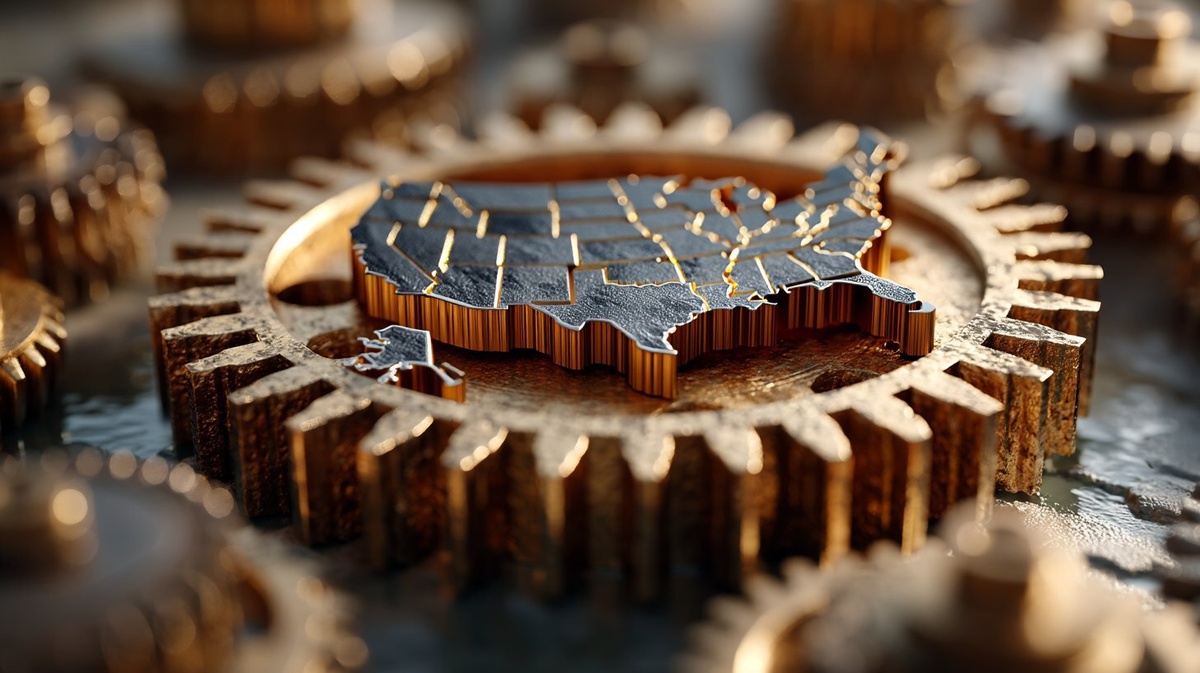 Создано на основе запроса: A cinematic historical concept showing a massive golden gear with the shape of the United States engraved at the