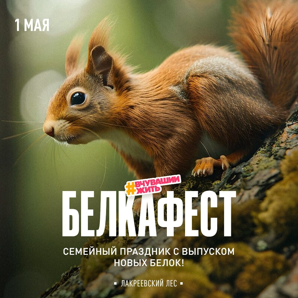 #вчувашиижить — с белками дружить А что, если отметить Первомай… выпуском белок? Новых жильцов планируют поселить в чебоксарском Лакреевском лесу в рамках празднования "БелкаФеста". Также в семейный праздник запланированы: 🔸 Захватывающий квест "Рыжий хвост" с призами. 🔸 Парад-конкурс "Белкина шубка". 🔸 Концерт и фотозона "Беличья семья". А что будете делать 1 мая вы? ⬇️ Картошка, шашлык, просто прогулки? Когда: 1 мая, 12.00. Подписаться/ Предложить новость