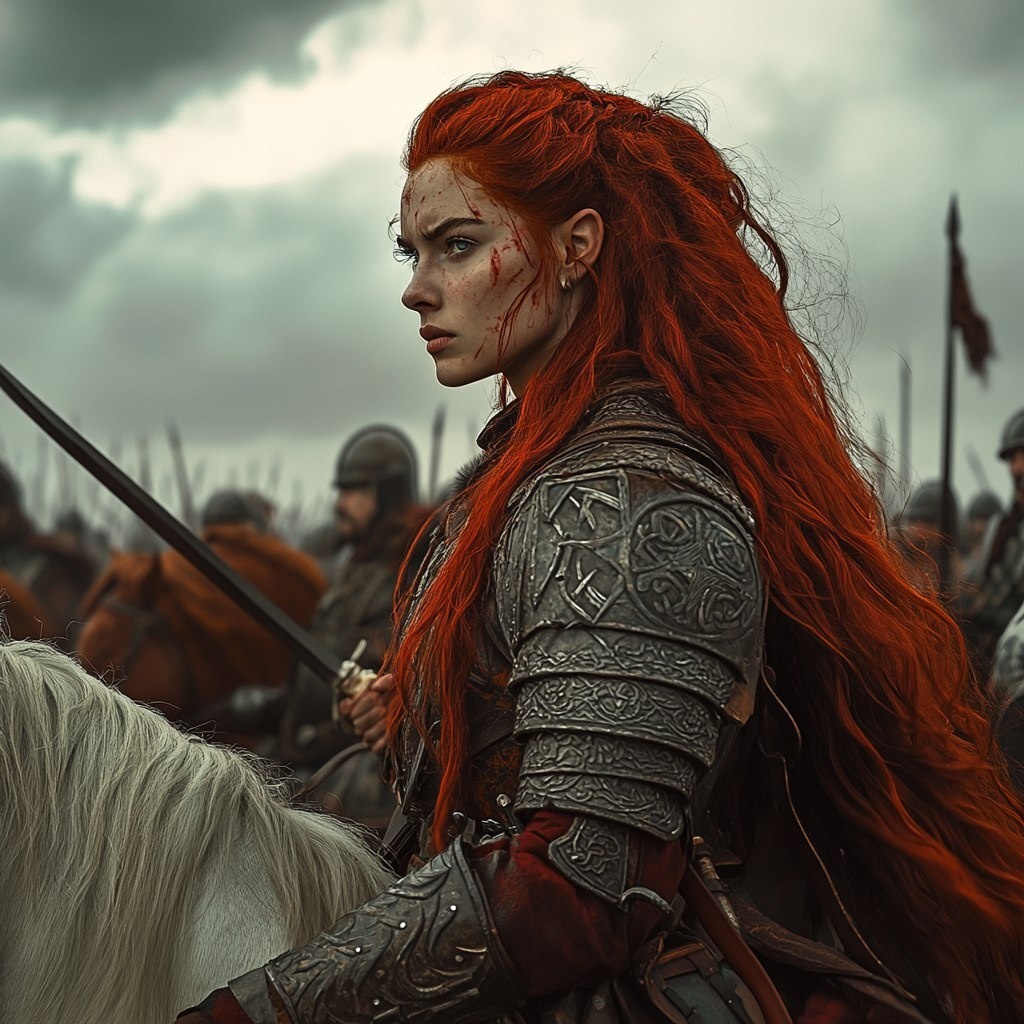 Создано на основе запроса: Boudica leading a massive army, on horseback, wild red hair flowing, ancient Celtic war paint, battlefield in