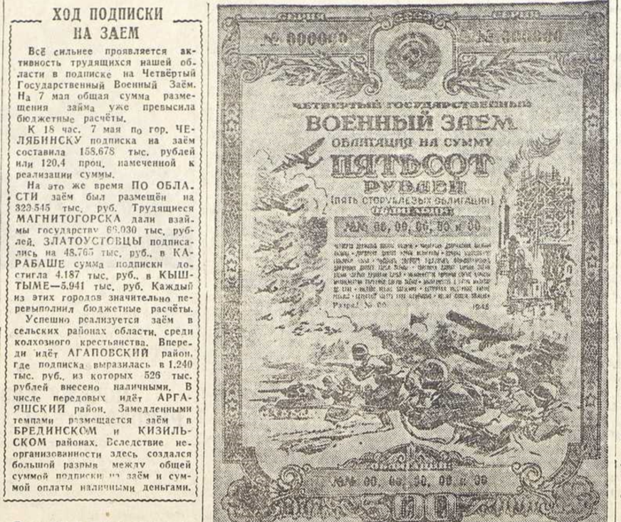 Все сильнее проявляется активность трудящихся нашей области в подписке на четвертый государственный военный заем. На 7 мая общая сумма размещения займа уже превысила бюджетные расчеты. К 18 час. 7 мая по гор. Челябинску подписка на заем составила 158,678 тыс. рублей или 120,4 проц. намеченной к реализации суммы. На это же время по области заем был размещен на 329,545 тыс. руб. Трудящиеся Магнитогорска дали взаймы государству 68,030 тыс. рублей. Златоустовцы подписались на 48,765 тыс. руб. В Карабаше сумма подписки достигла 4,187 тыс. руб., в Кыштыме — 5,941 тыс. руб. Каждый из этих городов значительно перевыполнил бюджетные расчеты. Успешно реализуется заем в сельских районах области, среди колхозного крестьянства. Впереди идет Агаповский район, где подписка выразилась в 1,240 тыс. руб., из которых 526 тыс. рублей внесено наличными. В числе передовых идет Аргаяшский район. Замедленными темпами размещается заем в Брединском и Кизильском районах. Вследствие неорганизованности здесь созда