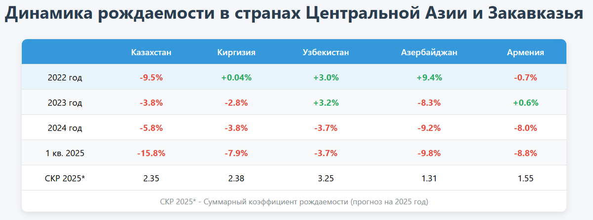 За первый квартал 2025 года падение рождаемости в странах Средней Азии и Закавказья продолжает ускоряться. Практически во всех этих странах наблюдается не только снижение числа новорожденных, но и увеличение темпов этого спада. Если текущая динамика сохранится, то суммарно в пяти государствах региона (Азербайджан, Казахстан, Киргизия, Узбекистан, Армения) рождаемость в 2025 году сократится более чем на 110 тысяч детей по сравнению с предыдущим годом.