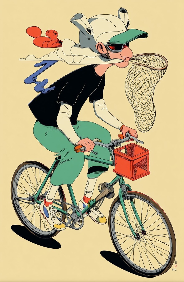 Создано на основе запроса: T-shirt design with a cool, funny character riding a bicycle wearing a bicycle helmet, holding a net in his hand