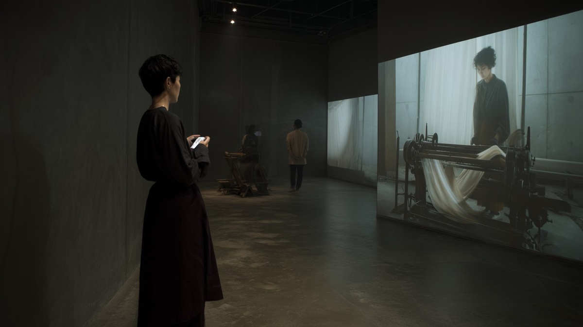 Создано на основе запроса: a creative museum streaming scene, one person are watching the projection and holding a phone at the same time, the projetion shows a women textiling fabric with a huge old ancestor textilemachinery, people that are watching the stream can comment on it, the comment shows on the projection, dark grey concrete museum mini space background --- Автоперевод: Творческий музей, потоковой сцена, один человек смотрит на проекцию и одновременно держит телефон. Как тебе иллюстрация? 🤔 https://dzen.ru/id/65c0c65c86e4f837c27b24d7 #ИИ #AI #нейросеть #midjourney #art