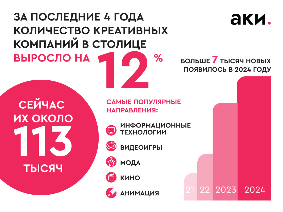 Только за последний год появились тысячи новых проектов в IT, видеоиграх, моде, кино и анимации. А число креативных компаний в Москве превысило 113 тыс. В чём причина быстрого роста? Помогают заявить о себе, поработать с известными экспертами и найти крупных заказчиков. «Фабрика видеоигр», например, объединяет начинающие команды и профессионалов индустрии для совместной разработки игровых проектов. Обеспечивают резидентов пространствами для работы, оборудованием и полезными сервисами. К таким платформам относится кластер видеоигр и анимации и московский кинокластер. Помогает увеличить продажи и рассказать о бренде. Серия ярмарок организуется специально, чтобы жители и гости столицы знакомились с продуктами московских брендов и отдельных креаторов: дизайнеров, художников, издателей. Москва помогает креативному бизнесу участвовать в международных выставках, бизнес-миссиях и крупных отраслевых событиях. В прошлом году при поддержке города было заключено около 100 международных контрактов,