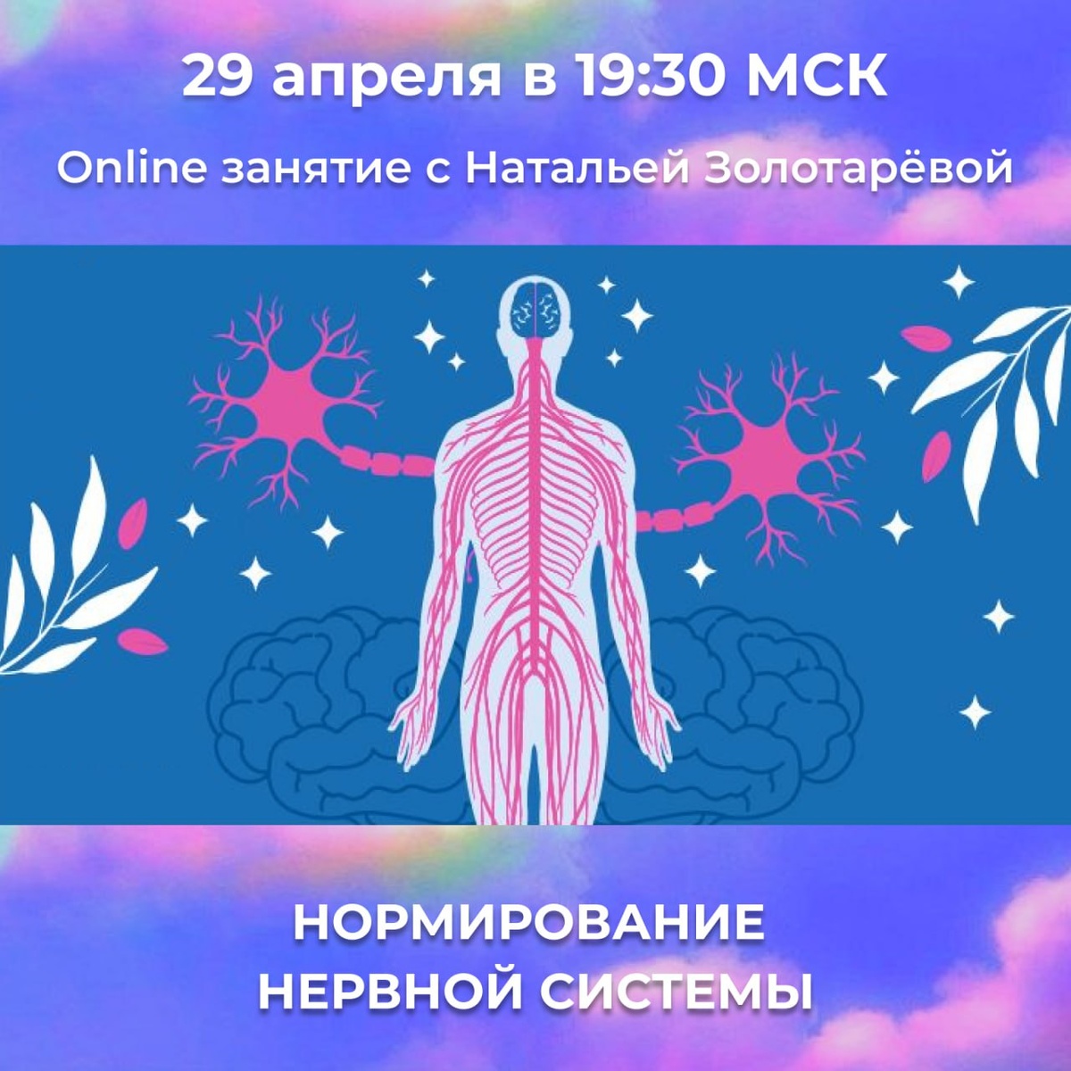 29 апреля (во вторник вечером) в 19.30 мск. вебинар с Натальей Золотарёвой на тему Нормирование нервной системы. https://so-razvitye.ru/online/gpg На этом занятии наши техники будут рассчитаны на адаптацию нервной системы к изменениям в жизни. В итоге вы станете более спокойными, уверенными в себе, сможете легче шагать в новое, укрепится понимание себя и своей роли в жизни. Для спокойной нервной системы нет безысходности, поэтому нормирование нервной системы приводит к новым идеям, планам и движениям по жизни. Если вы сейчас в чем-то не можете принять решение или не хватает уверенности, то это занятие вам поможет. Вначале занятия мы немного поговорим об адекватном восприятии информации, вспомним про духовную часть, и про саму нервную систему, а дальше займемся практической частью восстановления нервной системы, восстановления проводимости нервных импульсов, которые проходят через все тело и касаются каждого органа. После применения техник, будет нормироватьс