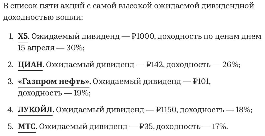 #Прогноз от аналитиков «Атон» с моими комментариями 🍏 #ИКС5 (#Х5) Ожидаемый дивиденд — 1000₽ 🟢Верга: Благодаря разовому дивиденду 648₽ акция может вырасти до 4100–4200₽, но после выплаты вероятен откат — аналогичный сценарий уже был с #ХедХантер. Вдобавок еще не до конца ушел навес после редомициляции. Исходя из финансовых результатов, в следующем году ожидаю дивиденд 250–350₽ на акцию. Более детальный анализ акции и спекулятивной идеи в ней — в этом посте. 📱 #ЦИАН Ожидаемый дивиденд — 142₽ 🟢Верга: