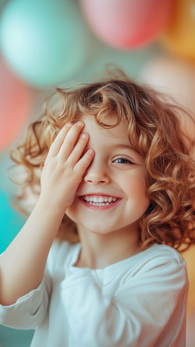 Создано на основе запроса: Realistic photo of a smiling child covering one eye and peeking through the other hand, playful pose