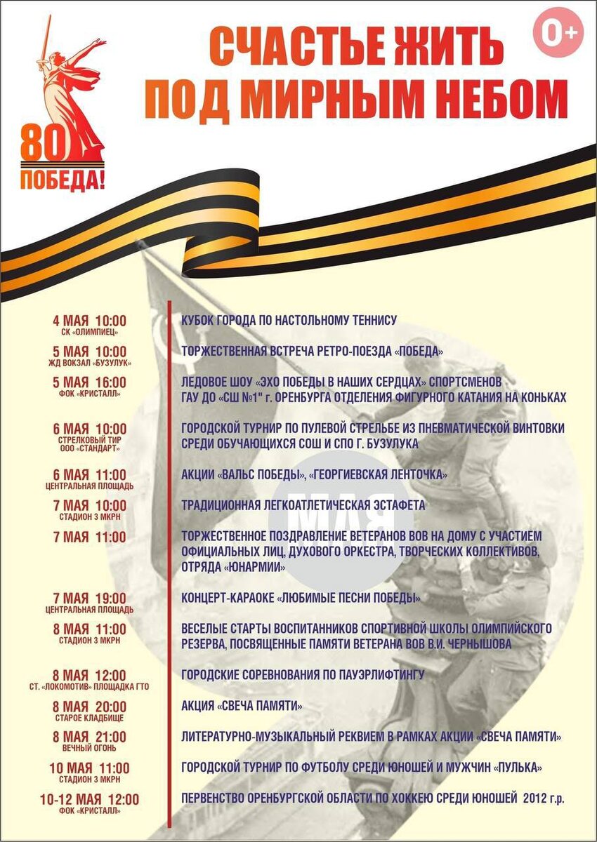 Программа празднования 80-летия Великой Победы в Бузулуке🎗️ Бузулучане и гости города! Приглашаем вас принять участие в торжествах, посвящённых 80-летию Победы в Великой Отечественной войне — главному празднику нашей страны.