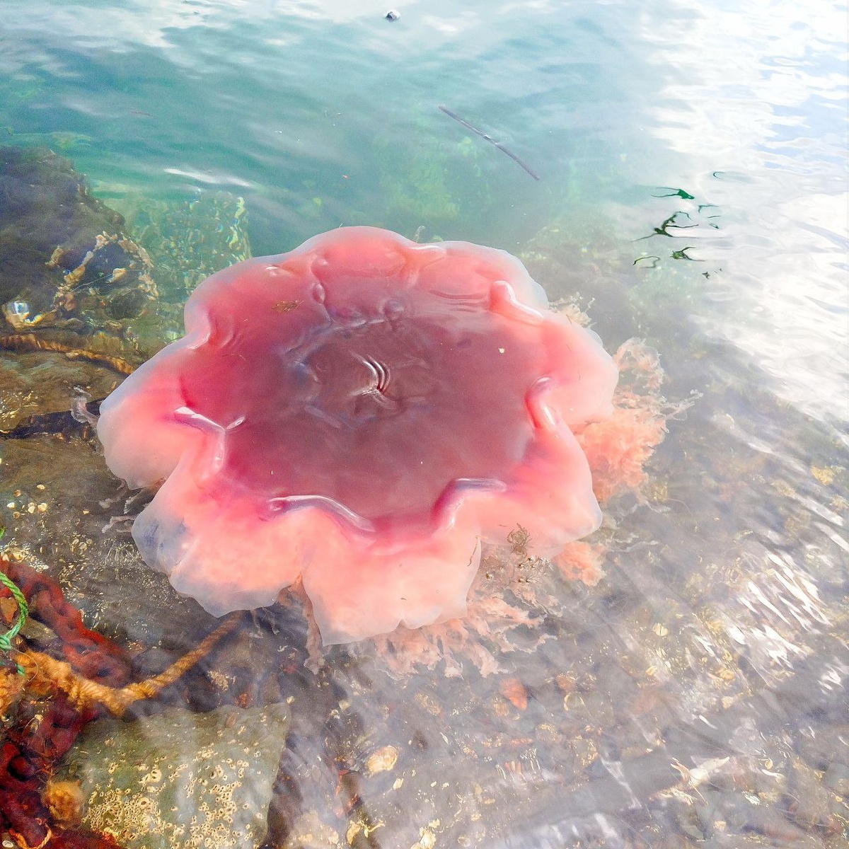 Это розовый чепчик, который кто-то потерял в море? Нет, это волосистая цианея — такая медуза в стиле барби. Обычно они вырастают до полуметра, но бывают с диаметром купола около двух, представляете? Их щупальца могут вытягиваться в десятки метров. Такие медузы редко выходят к берегу. Цианеи — хищники. Они впрыскивают в тело жертвы яд, способный убить мелких животных и ранить крупного. Они нападают на планктонов, а иногда на других медуз. Для человека не опасны. Максимум может быть аллергия или сыпь. Фото: Сергей Труболыс 🟥Подписаться | Предложить новость