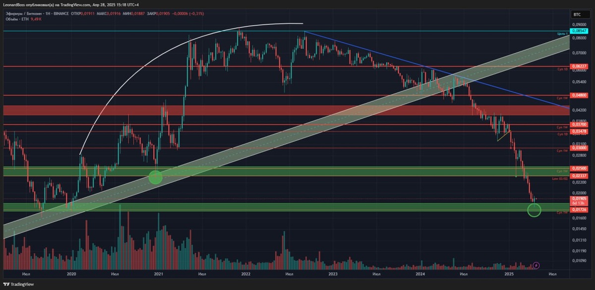 #ETH/BTC 🔽Глобально🔼 ⚠️Давненько не делал в постах обзор этого графика. Кто смотрел крайний ролик на канале, тот из последних мыслей что-то помнит. Спустились в самую яму, по сути последняя глобальная понятная поддержка. Этот блок и уровень последний раз отрабатывали в 2019-2020г.г. RSI на недельном графике показывает исторический LOW, ниже 24!! P.s. в принципе больше и сказать нечего, всё на графике. Это лишь ещё одно мощное подтверждение, что на рынке и "невозможное" = возможно! Обратите внимание на прошлую недельную свечу, она великолепна для разворота. И помним про большую вероятность ретеста Low, слева на графике четкий пример!!!