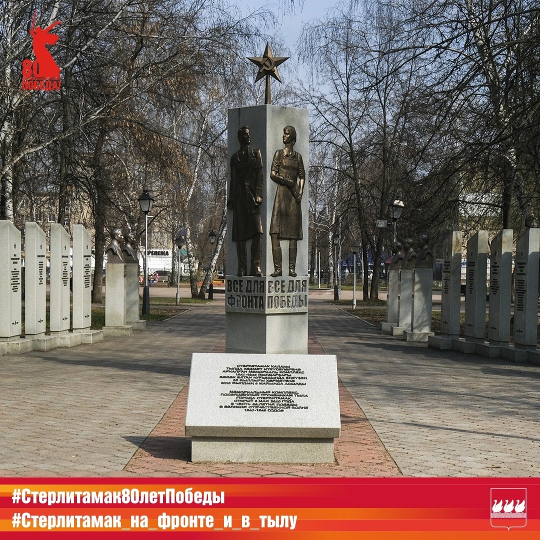Так, в сквере им. Жукова 6 мая 2010 года был открыт монумент Труженикам тыла. Он представляет собой бетонную стелу в виде призмы, на лицевых гранях которой размещены барельефы мужчины и женщины — тружеников тыла. Ниже находится надпись «ВСЁ ДЛЯ ФРОНТА! ВСЁ ДЛЯ ПОБЕДЫ!». На вершине стелы установлена пятиконечная звезда. На дорожке к монументу расположена мемориальная плита с надписью на башкирском и русском языках: «Мемориальный комплекс, посвящённый труженикам тыла города Стерлитамак, открыт 6 мая 2010 года в честь 65-летия победы в Великой Отечественной войне 1941−1945 годов».