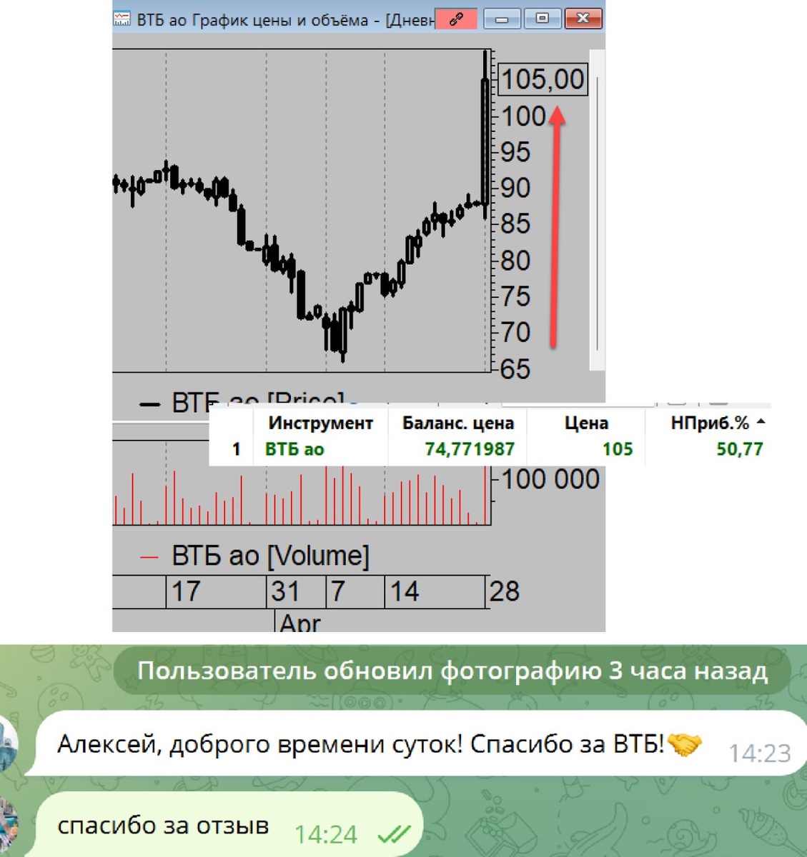 ‼️📈В нашем инвесторском клубе, мы покупали ВТБ на последней просадке рынка. (подпитска тут - @SubProfitGateBot) Там я объяснял почему покупаю бумагу.. А управляющие фондами отдельно объясняли почему по внутренним корпоративным событиям всё выходит так, что скоро дивиденды могут начать платить. 🤑На сегодня за парочку недель мы заработали уже 50% прибыли. Теперь люди пишут благодарности :) С портфелем бумаг по прежнему всё великолепно. Ведь набраны именно такие бумаги, где надо немного подождать и в итоге получается вот так :) ☝️При чём почему так получится и что именно на это ставка, писалось заранее.