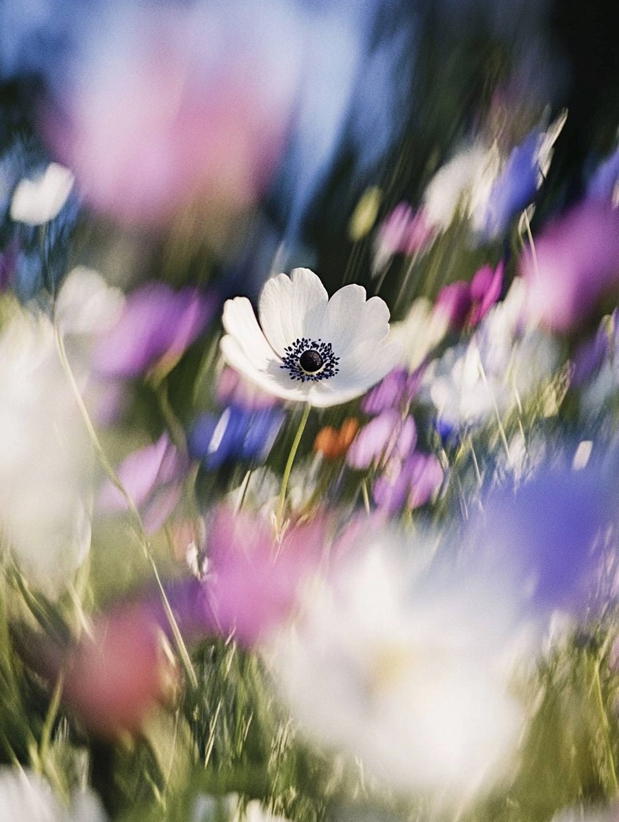 Создано на основе запроса: Anemone flower with purple, blue, and white flowers blurred in the background