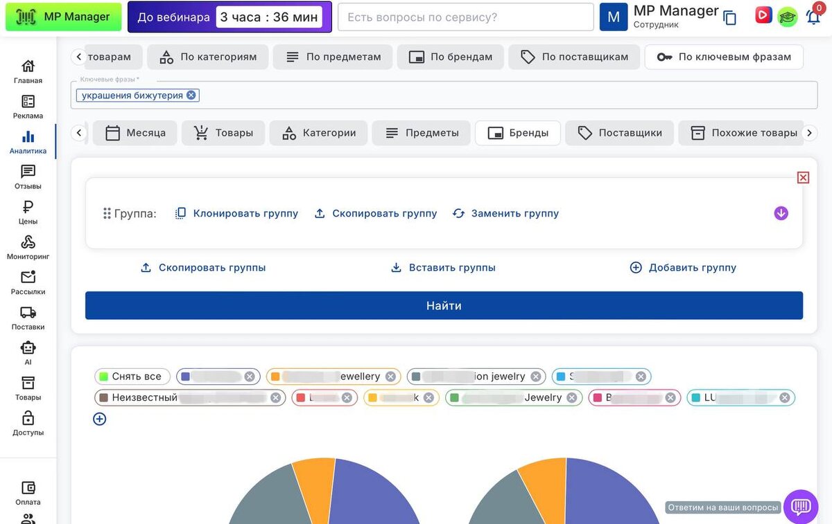 Узнайте, как рекламируются конкуренты, и будьте на шаг впереди! 🕵♂️ Анализ конкурентов – ключ к успешной рекламе! MP Manager можно отслеживать рекламные стратегии конкурентов, изучать их ключевые фразы и повторять лучшие решения. 🔹 Как это работает? ✔️ Мониторинг конкурентов – анализируйте, какие ключевые слова они используют. ✔️ Сравнение ставок – смотрите, кто ставит больше и в какие часы. ✔️ Анализ органики – определяйте, какие товары продвигаются без рекламы. 💡 Как это поможет вам? 📌 Выбирайте эффективные ключи, которые работают у лидеров. 📌 Оптимизируйте ставки и избегайте лишних затрат. 📌 Настраивайте стратегию так, чтобы обойти конкурентов. 🔖 Вам в этом помогут: «Мониторинг», Аналитика в «Мониторинге», использование ключей конкурентов (можно их добавить в «Избранное») Недавно мы добавили 8 новых полей в Подбор кластеров, чтобы глубже анализировать рекламную активность конкурентов . Теперь можно видеть не только количество товаров, брендов и поставщиков, но и их долю