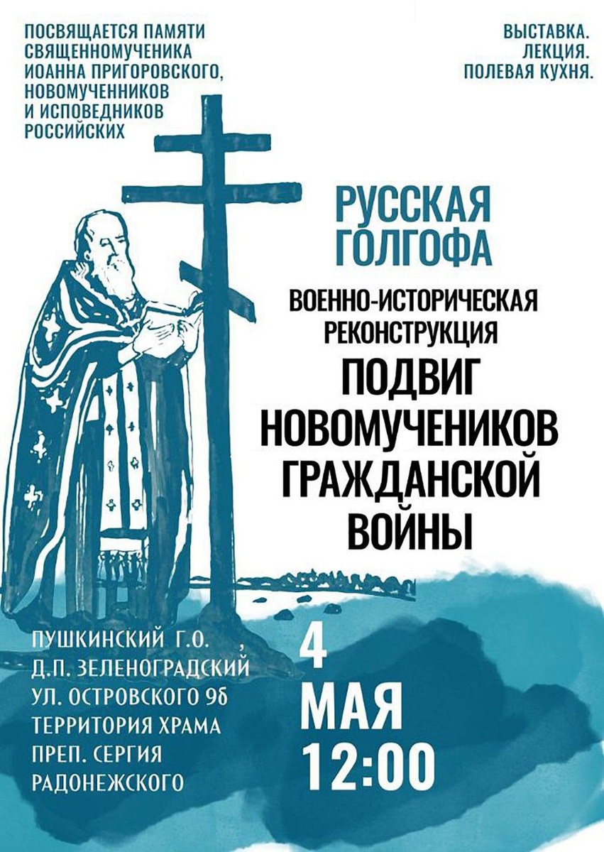 4 мая в Зеленоградском состоится лекция и выставка "Русская Голгофа", посвящённая подвигу новомучеников и исповедников Русской Земли. Лекцию проведёт прихожанин храма, историк Алексей Конопатченков. После на подворье организуют военно-историческую реконструкции, посвященную памяти священнослужителей и мирян, отдавших жизнь за Христа на Донской и Кубанской земле в период Гражданской Войны! @pushkinomedia