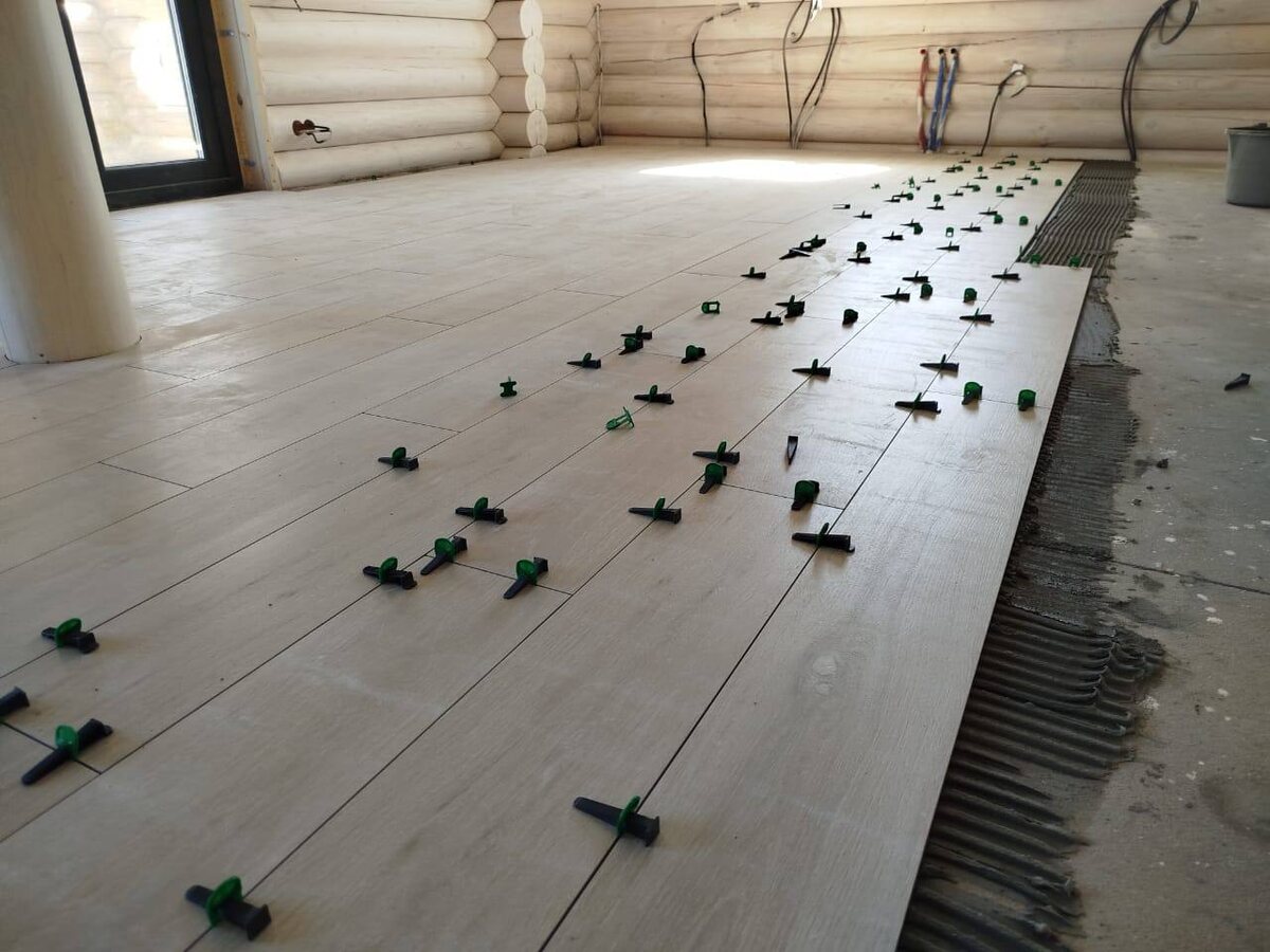 В Марьиной горе полным ходом идут плиточные работы. Традиционно-на полу плитка под натуральную доску