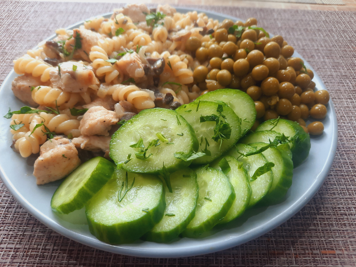 Люблю простые рецепты с хорошим вкусом. Этот рецепт один из них. Куриная грудка с грибами и макаронами в сырном соусе. Ничего особенного, все ингредиенты простые, но результат замечательный. Вкусно, сочно, сытно и полезно. После такого блюда долго сохраняется сытость, а значит срывы не грозят. Дополнить салатом из овощей и отличный обед порадует вас вкусом и пользой. ПРИГОТОВЛЕНИЕ: В сковороду наливаю растительное масло, у меня горчичное, и слегка разогреваю. Добавляю к маслу лук мелко нарезанный и немного воды, 50 мл. Готовлю под крышкой в течении 3-5 минут до мягкости. Затем добавляю в сковороду мелко нарезанные грибы. Грибы можно использовать любые, у меня обычные шампиньоны. К грибам добавляю сухой чеснок и готовлю ещё 3-5 минут. Далее к луку и грибам добавляю куриную грудку и приправу для курицы, солю и перчу по вкусу. Перемешиваю и готовлю пару минут всё вместе под крышкой. Затем добавляю в сковороду макаронные изделия из твёрдых сортов пшеницы. Заливаю всё горячей водой и довож