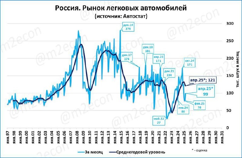 Интересное графическое отображение здоровья экономики - регистрации новых легковых автомобилей. Сначала про вторую картинку. Если внимательно присмотреться, то мы там, где бывали: в 2008, в 2014, в 2020, в 2022. То есть там, где были кризисы в нашей экономике. А вот первая картина еще более мрачная и отражает суровую действительность нашей экономики (и не только нашей. Почти всех, кроме США). В 2008 году был поставлен пик нашей экономики и благосостояния. Все остальное время мы просто (как почти и все страны) платим за благосостояние США. И говорю я это не из-за нездорового патриотизма, а от сухих цифр и сравнения, которое я когда-то проводил на графиках всех стран (если сейчас найду, то в комментарии брошу ссылку на тот фрагмент эфира)