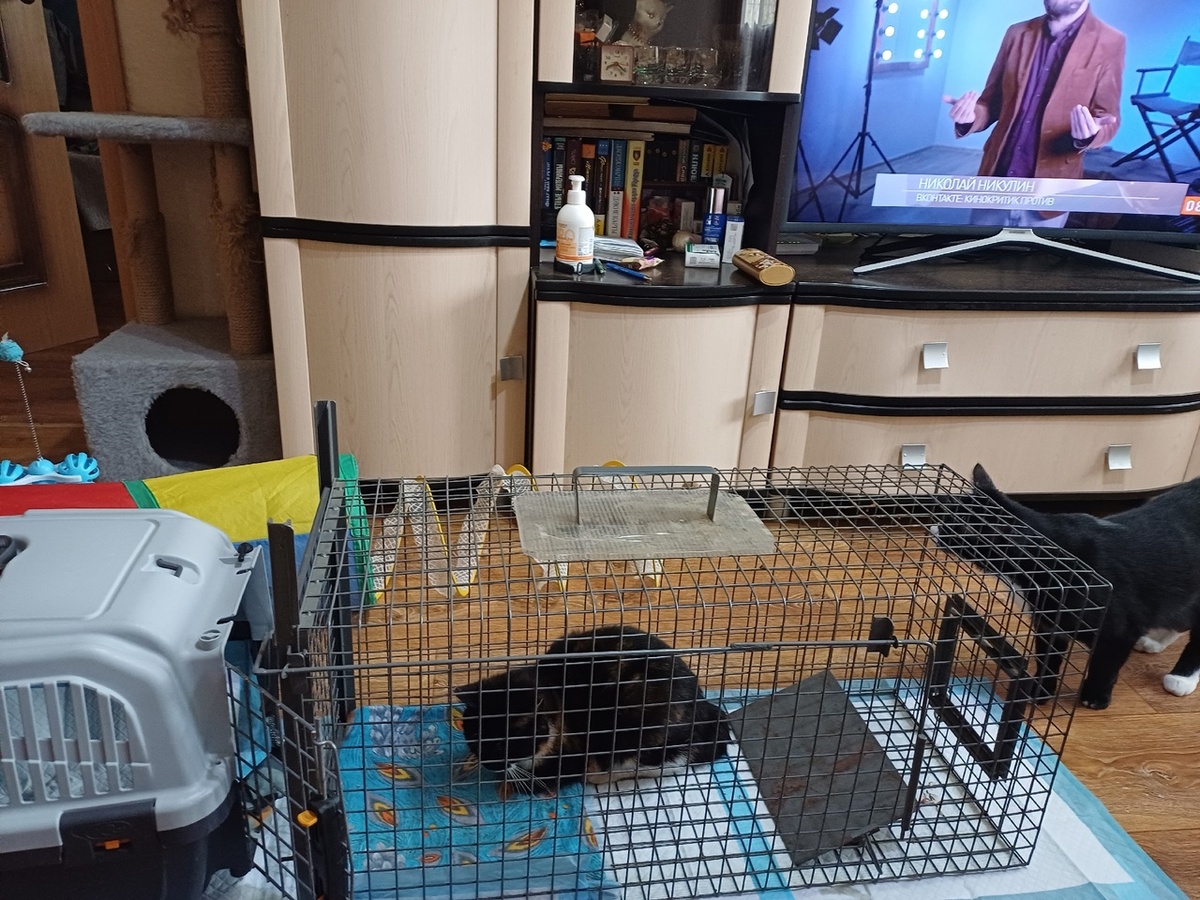 Эта девочка, котенок-подросток, буквально приползла к одному из предприятий области. Одна из передних лап не работала вообще, на заднюю она пыталась опираться, но у нее плохо получалось. На питомице был надет противопаразитарный ошейник. Получается, кошечка была чьей-то, но проблемы с лапами, а с виду это были застарелые кров о точащие раны, никто не решал. Местная волонтер приняла решение об отлове, но когда она приехала, котенка на месте не оказалось.