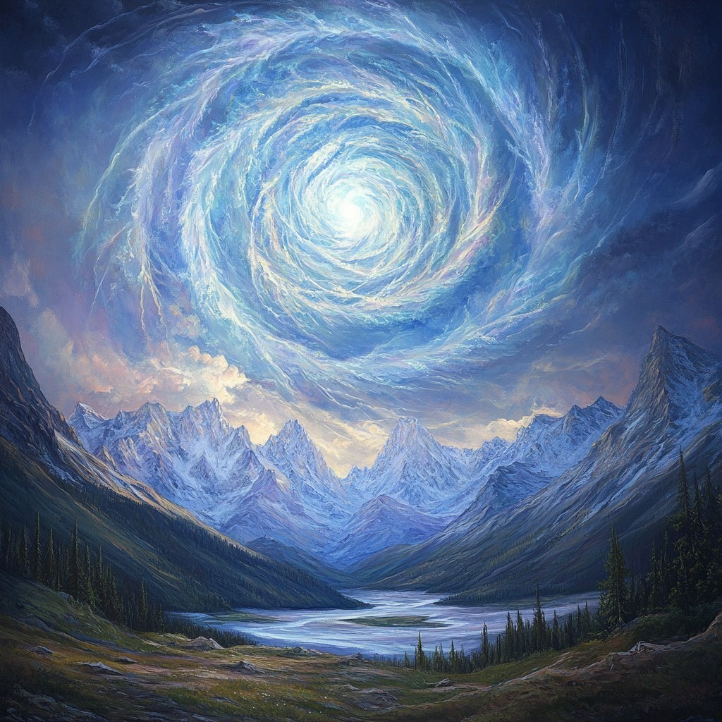 Создано на основе запроса: beautiful mountain scene with mystical energy swirling in the sky forming a mandala, universal consciousness