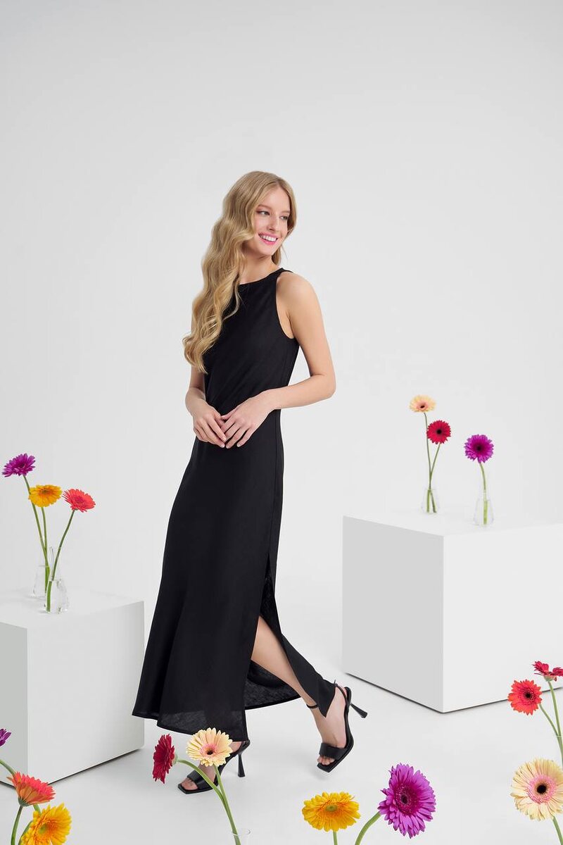 Невесомые фактуры и весенняя палитра воплотились, например, в виде изящных платьев из дышащего льна в оттенках розового и угольно-черного.