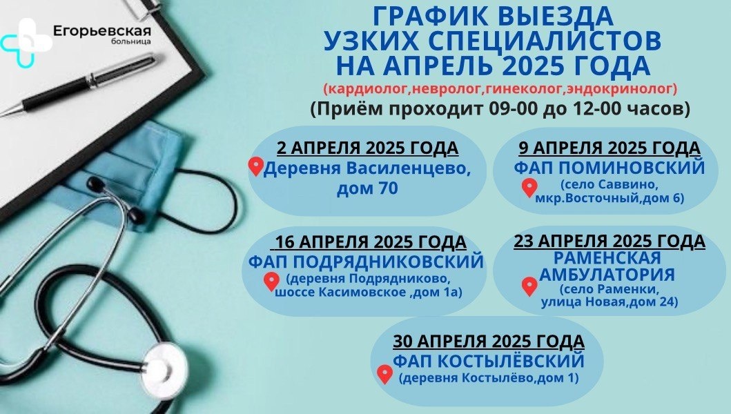 ГРАФИК ВЫЕЗДОВ УЗКИХ СПЕЦИАЛИСТОВ ГБУЗ МО "ЕГОРЬЕВСКАЯ БОЛЬНИЦА" НА АПРЕЛЬ 2025 ГОДА
