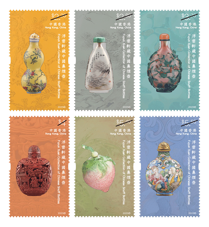 "Floating Cloud Xuan" - это частная коллекция китайских бутылок для нюхательного табака, созданная покойным гонконгским коллекционером г-ном Син Чо-химом. Вдова г-на Сина, г-жа Син Шек Юн-юк, пожертвовала предметы Гонконгскому музею искусств для постоянной коллекции, позволив публике оценить эти драгоценные культурные сокровища. Маленький и нежный флакон для нюхательного табака объединяет в в себе множество ремесел, как и историю китайского искусства. Продолжая специальную серию марок «Основные моменты из коллекции Гонконга», Почта Гонконга выпускает набор из шести марок и двух листов марок под девизом «Основные моменты коллекции Гонконга – китайские нюхательные бутылочки из коллекции Floating Cloud», демонстрируя отличительные китайские нюхательные бутылки из коллекции Floating Cloud, охватывающие различные материалы и стили, включая стекло, хрусталь, лаковые изделия, керамику и другие категории. Почтовые марки выпускались в листах по 10 штук в листе на каждый сюжет. Размер марки 30*