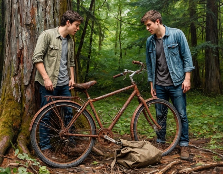 На небольшой поляне, скрытой деревьями, стоял старый ржавый велосипед. Его рама была покрыта мхом, а шины давно сдулись. Рядом валялась потрепанная сумка, из которой торчали какие-то бумаги. Но самое странное было не это. На дереве, прямо над велосипедом, кто-то вырезал символ — круг с тремя линиями внутри, похожий на глаз.
