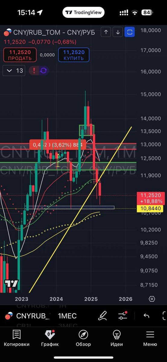 #доллар #юань По валюте пока ничего нового. Если ориентироваться на юань, то точка притяжения 10.84. И там чуть ниже есть еще полоски 100-месяцев. В районе 10.77. Вот примерно из зоны 10.77-10.84 я могу допустить сильный отскок и среднсрочный рост. А вот станет ли он разворотным - это пока еще большой вопрос. Я продолжаю считать, что мы вполне можем увидеть бакс с цифрами 6Х. Это будет дешево. Но и по 75-76 (если сопоставить с точкой притяжения) - это будет приемлемо. И это будет первое место, где я могу начать рассматривать валюту к покупке