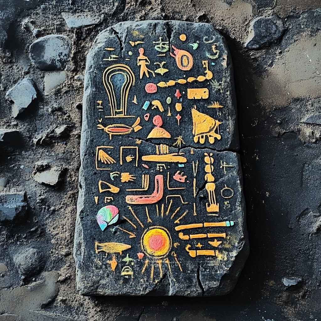 Создано на основе запроса: stone tablet depicting instructions, ancient symbols, ghibli vibes, colorful, mysterious, playful