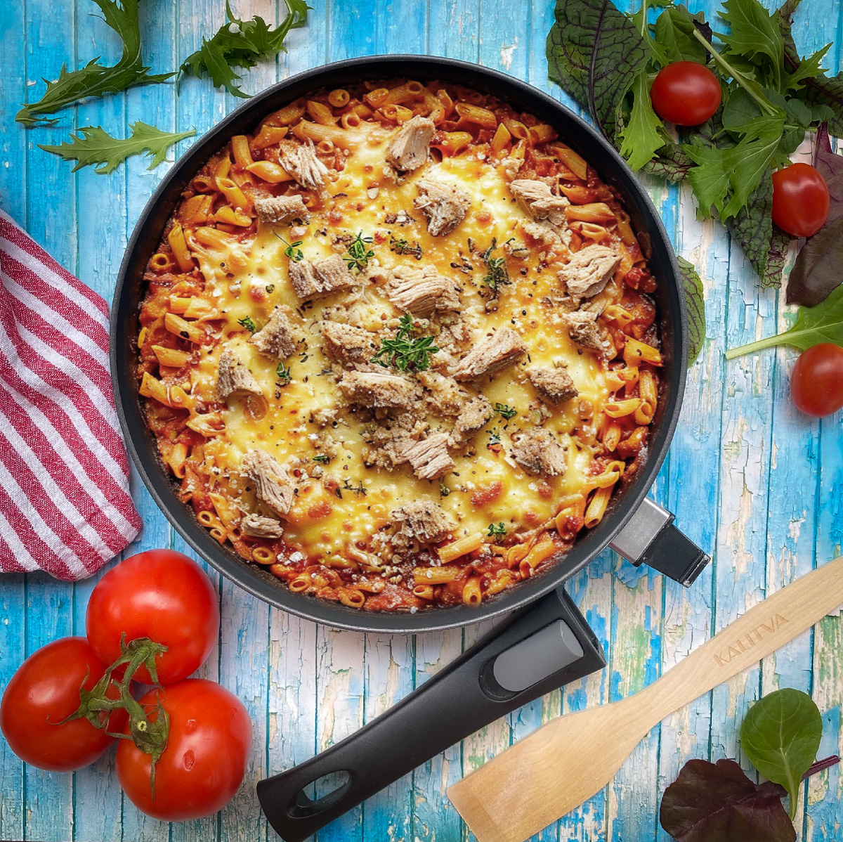 🍝 Запеканка из макарон, тунца, сыра и томатов — в нашем сотейник KUMIR HANDLE, со съёмной ручкой — быстро, сытно и очень по-домашнему! 🤍✨ 🔸 Макароны (лучше короткие – ракушки, спиральки или пенне) — 250 г