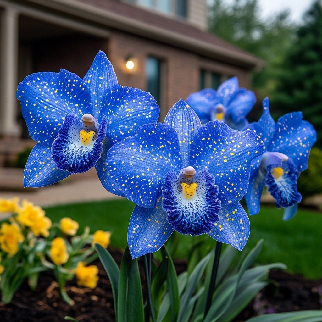 Создано на основе запроса: A realistic flowerbed in front of a cozy suburban house, planted with beautiful blue orchids with yellow polka