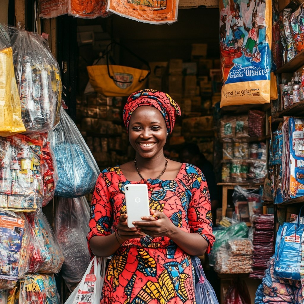 Создано на основе запроса: an african female market woman in front of her store happy showing her white phone screen while a customer walks