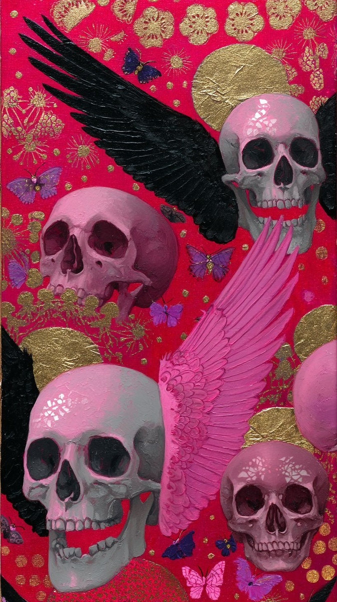 Создано на основе запроса: poetry of yokai skulls with pink gilded wings being lifted as cathedrals of thought